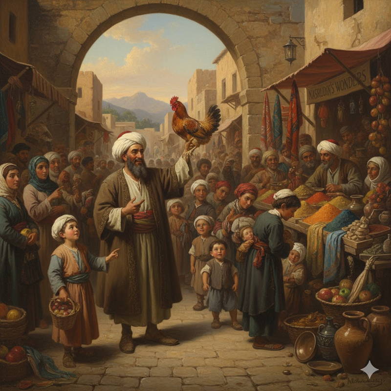 Al día siguiente, llevó su gallina al mercado. Nadie le ofrecía más de cincuenta riyales por ella.